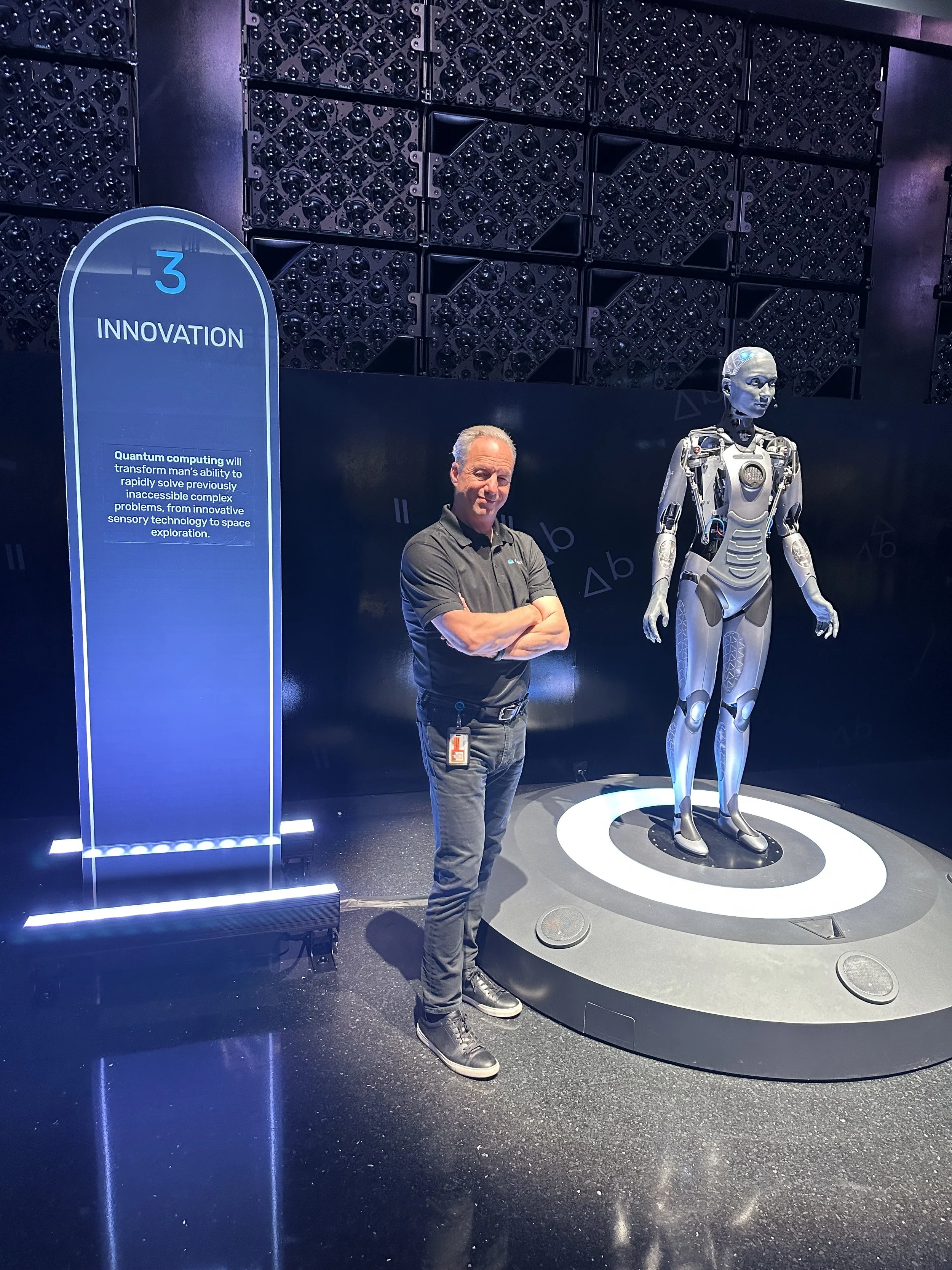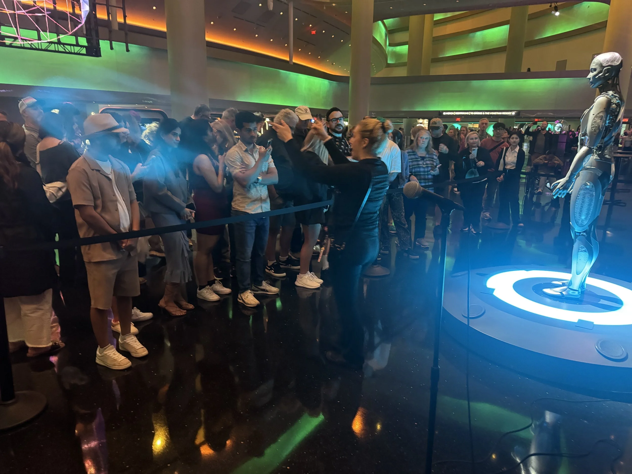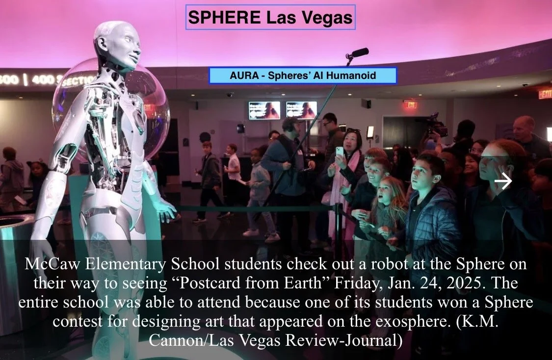 Dwight Kennedy chatting with Aura, the AI humanoid robot at her home in Sphere, Las Vegas.